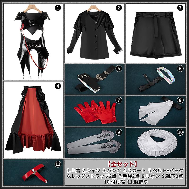 上着、シャツ、付け襟、パンツ、スカート、手袋2点、飾り物(リボン、腕飾り、ベルト+バッグ、レッグストラップ2点、靴下2点)