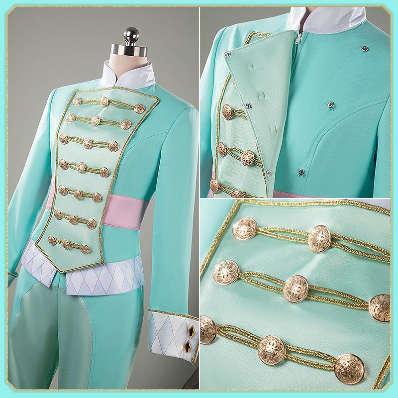 ポリコットン+リップル生地で製作しています。吸水性や通気性が良くて涼しいです。水色を基調として、爽やかな印象は特徴です。胸に金属ボタン、両袖にひし形ボタンで飾られて再現度が高いです。