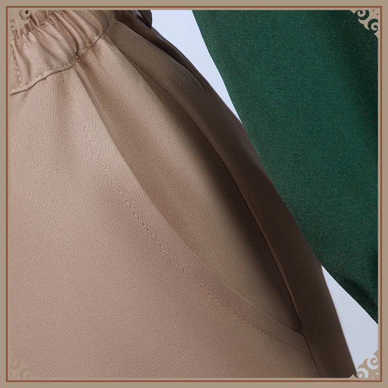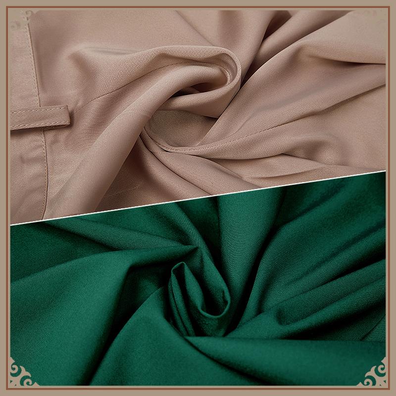 ウォールサテンで製作しています。光沢感が強く、滑らかな肌触りです。両サイドにポケットが施されて、とても便利です。腰の部分にゴムが入ったので、着心地が良いです。