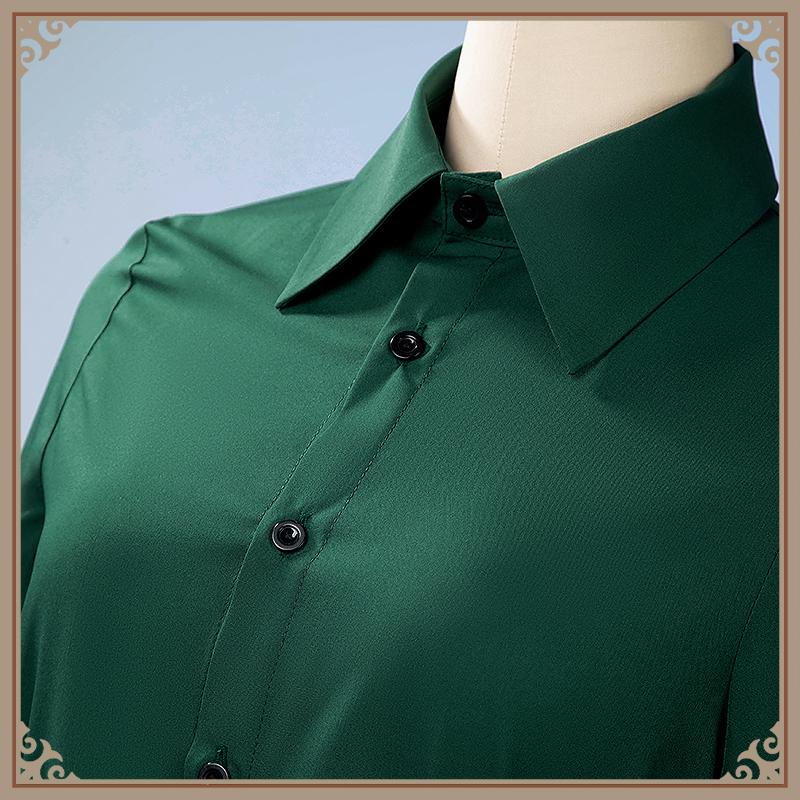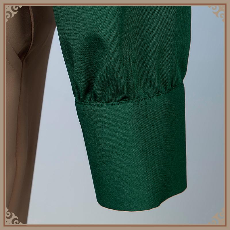 シャツ生地で製作しています。緑色を基調として、フロントに黒いボタンが施されています。シンプルなデザインで、普段にも着られます。