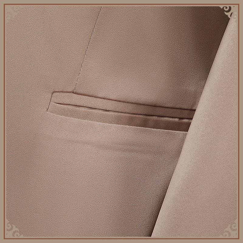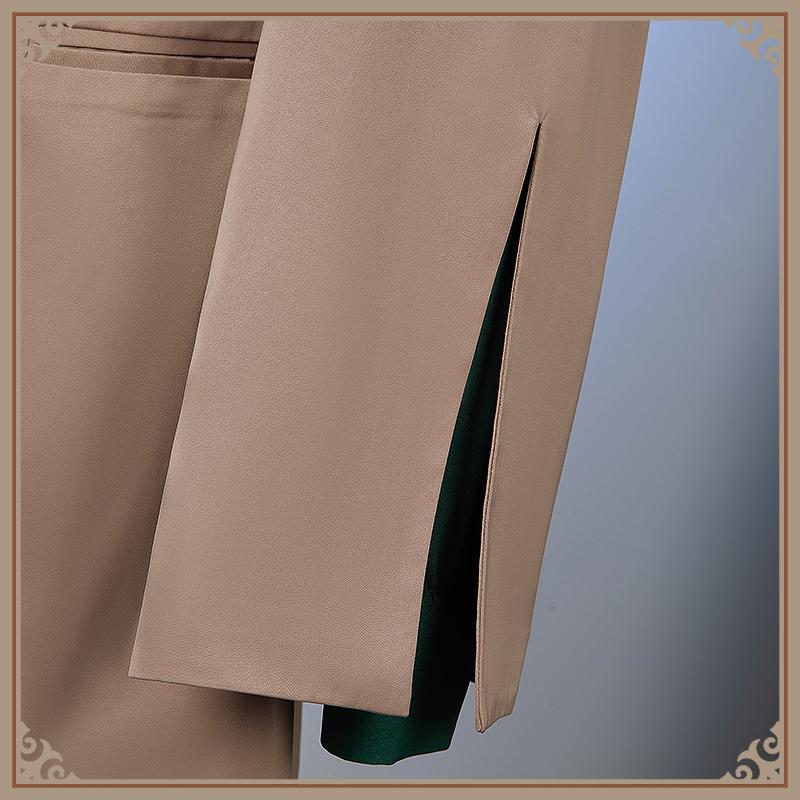 ウォールサテンで製作しています。カーキ色を基調として、襟周りに金色の花刺繡が施されています。後ろにベンツがあります。両袖にもベンツがあり、中の濃い緑色のシャツが見えます。