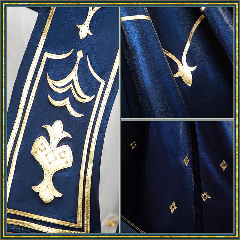 光沢布で製作しています。深みのあるブルーを基調に、ゴールドの縁取りが鮮やかに映えるこの衣装は、舞台上で際立つ存在感を演出します。