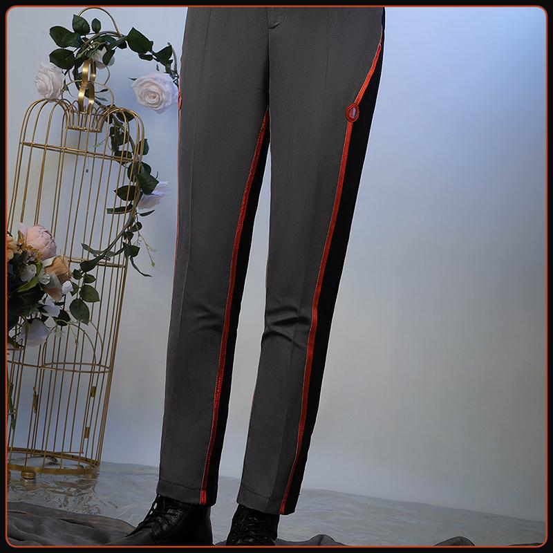 スエード生地とTRで製作しています。襟が立っていて、胸に金属ボタンが施されて、ロントにオレンジレッドラインが飾っており、体形にあわせて立体的に仕上げています。