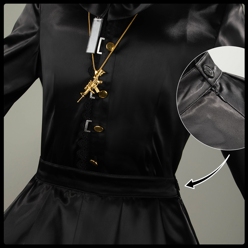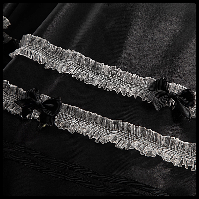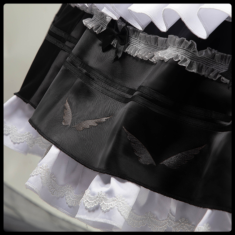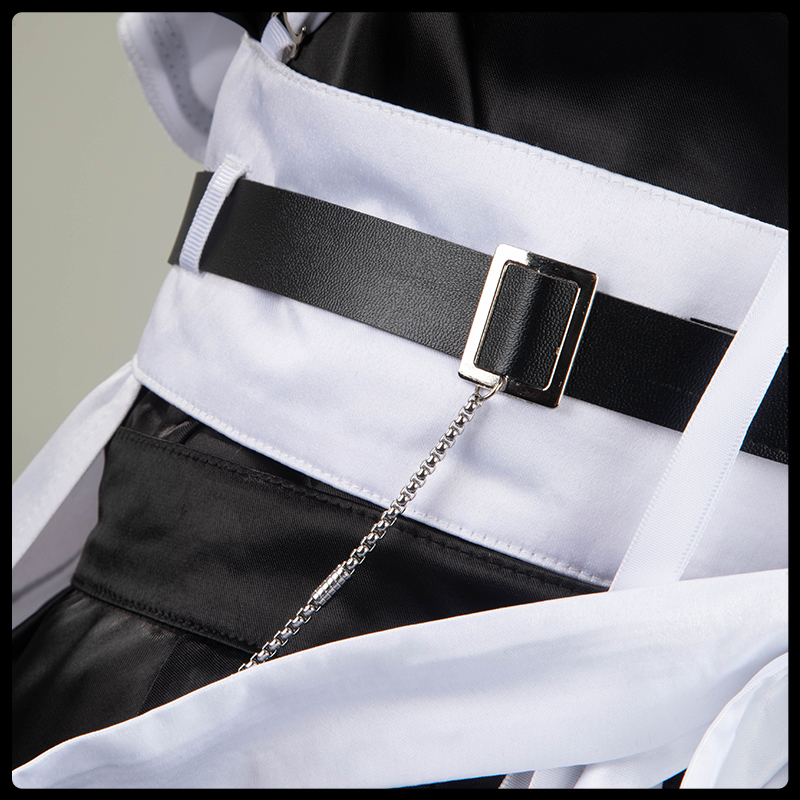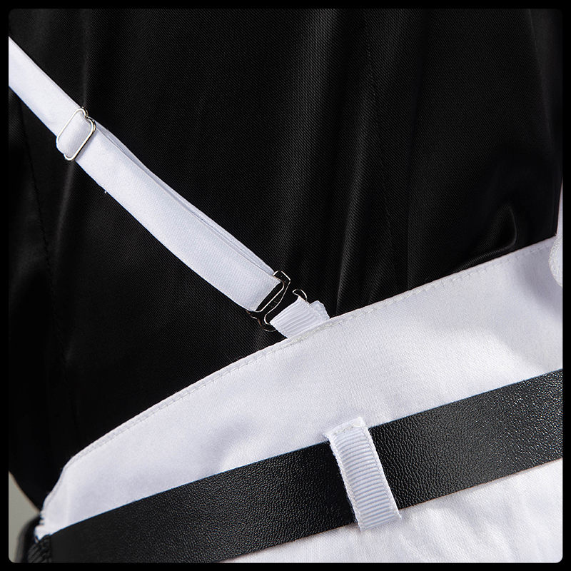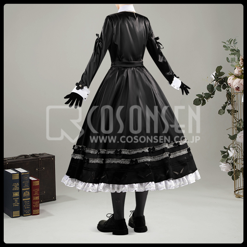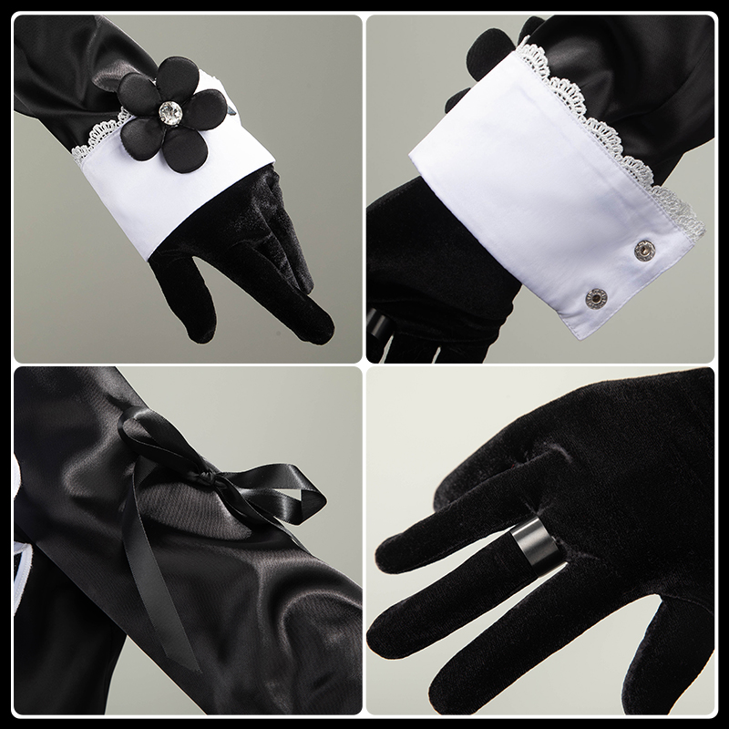ストレッチサテン+シャツ生地で製作しています。いい素材を使ったので、着心地と換気性が良いです。黒と白の組み合わせ、両袖にリボンが付き、袖先はシャツ・カフスのデザインです。袖口にライスと可愛い黒い花が縫い付けています。