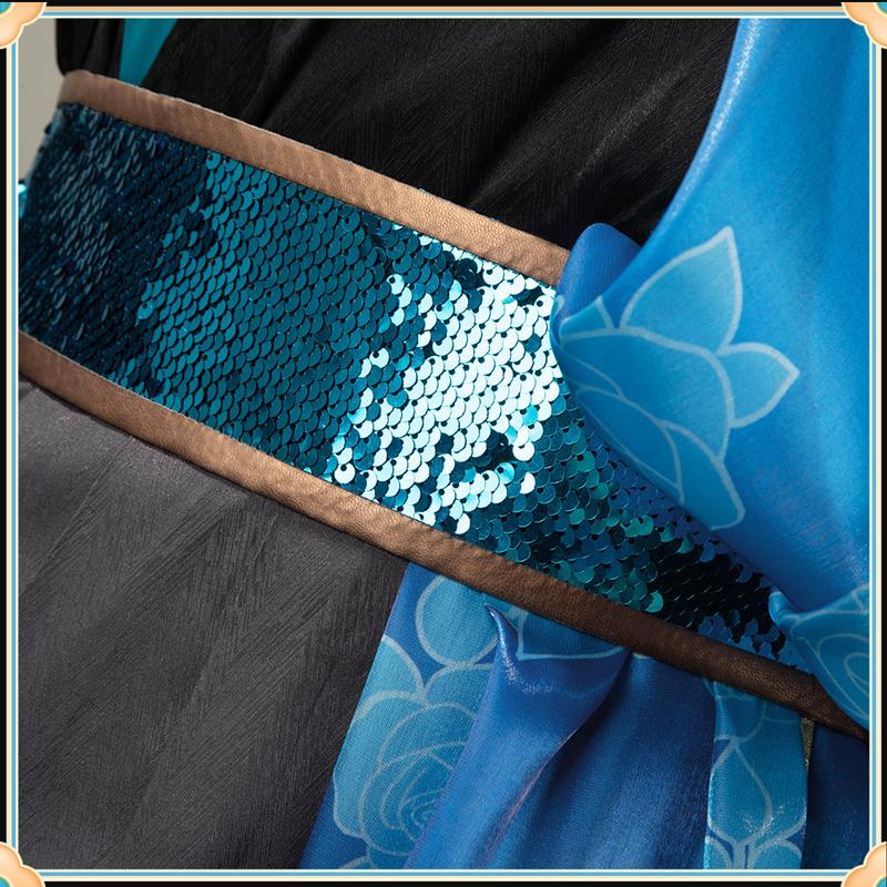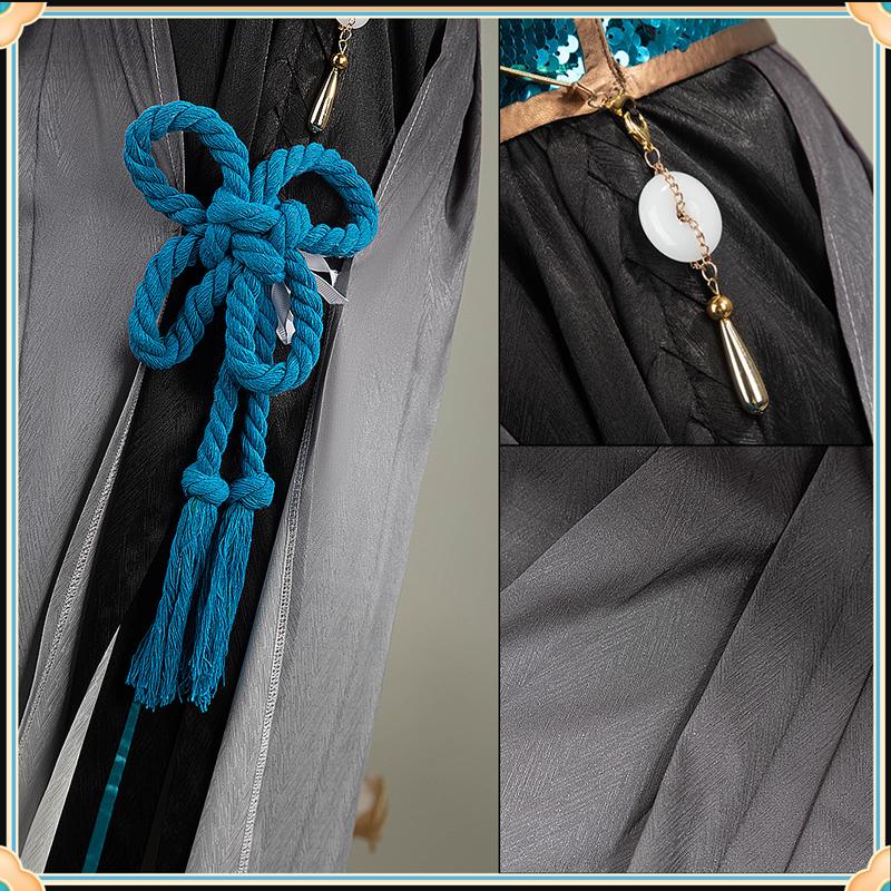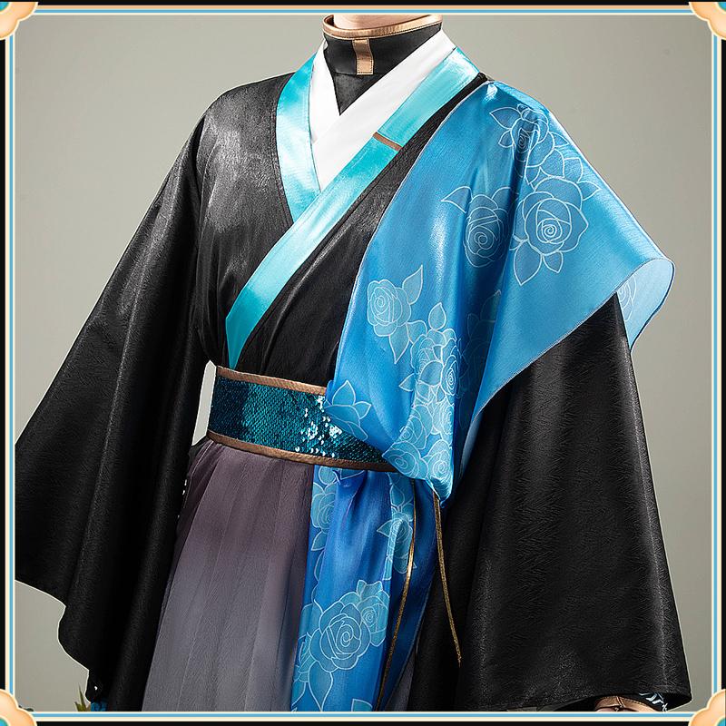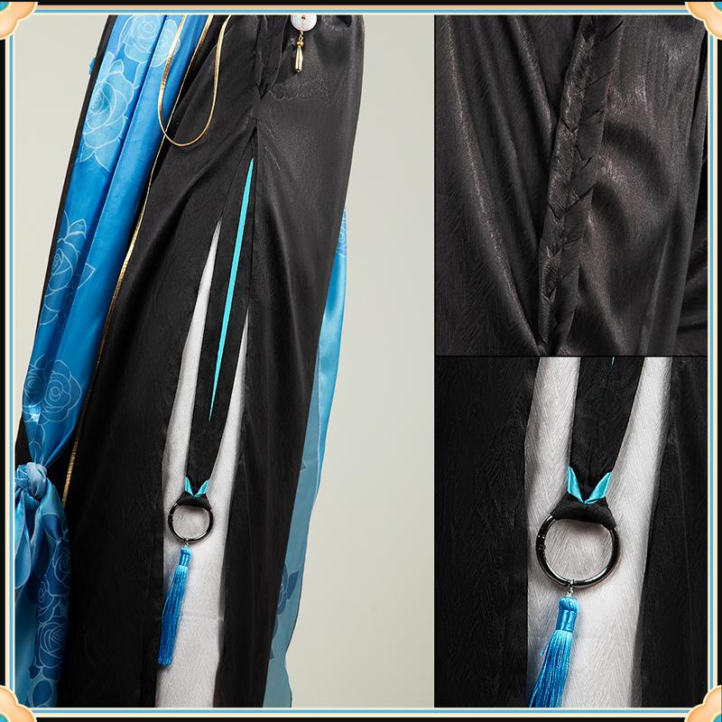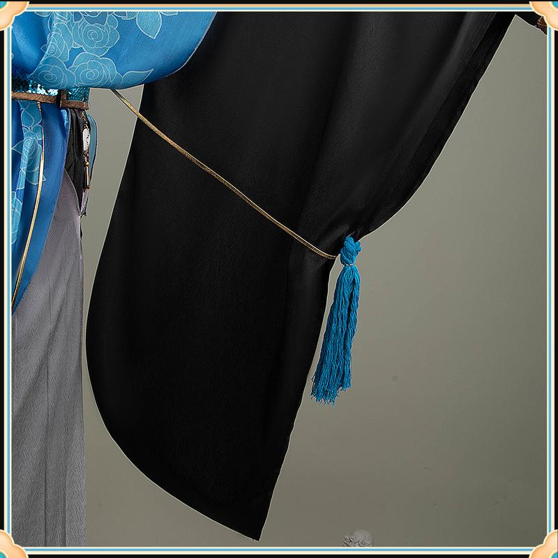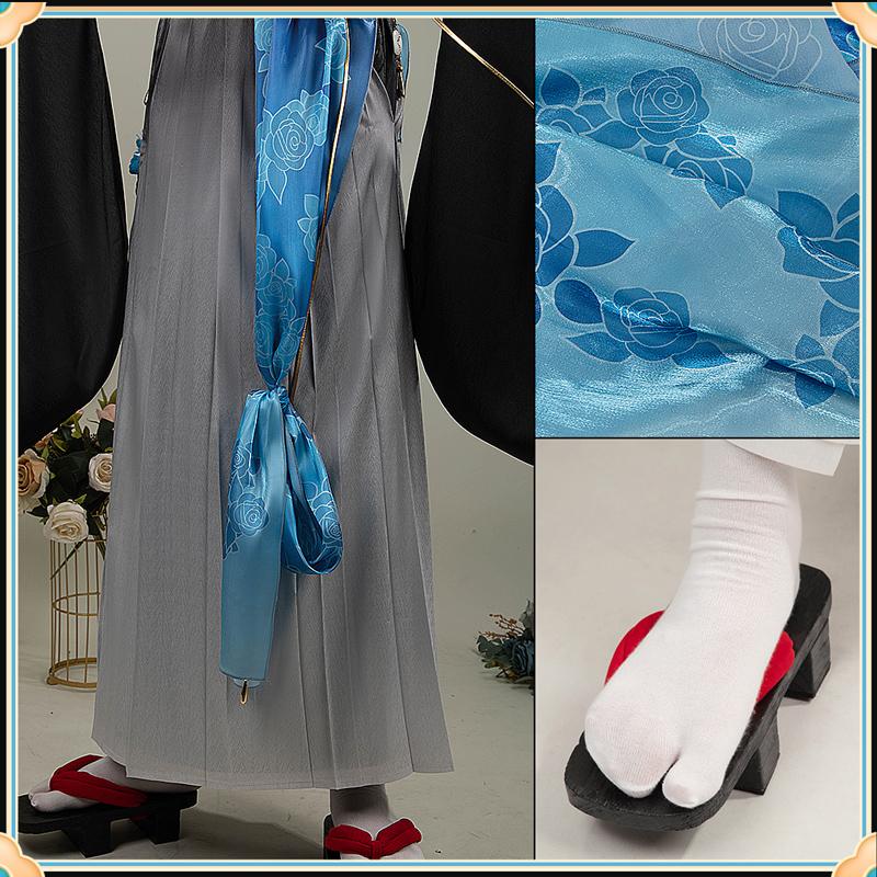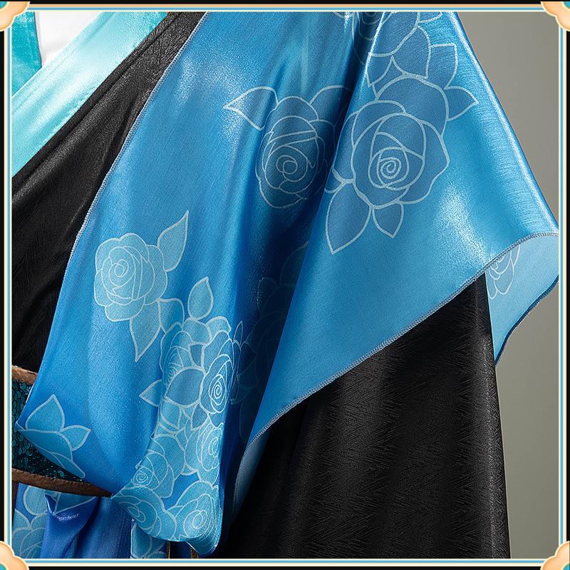 ヘリンボーンで製作しています。黒を基調として、襟にブルーサテンで縁取りされています。ブルー肩掛けに原作に忠実な絵柄が綺麗にプリントされて再現度が高いです。