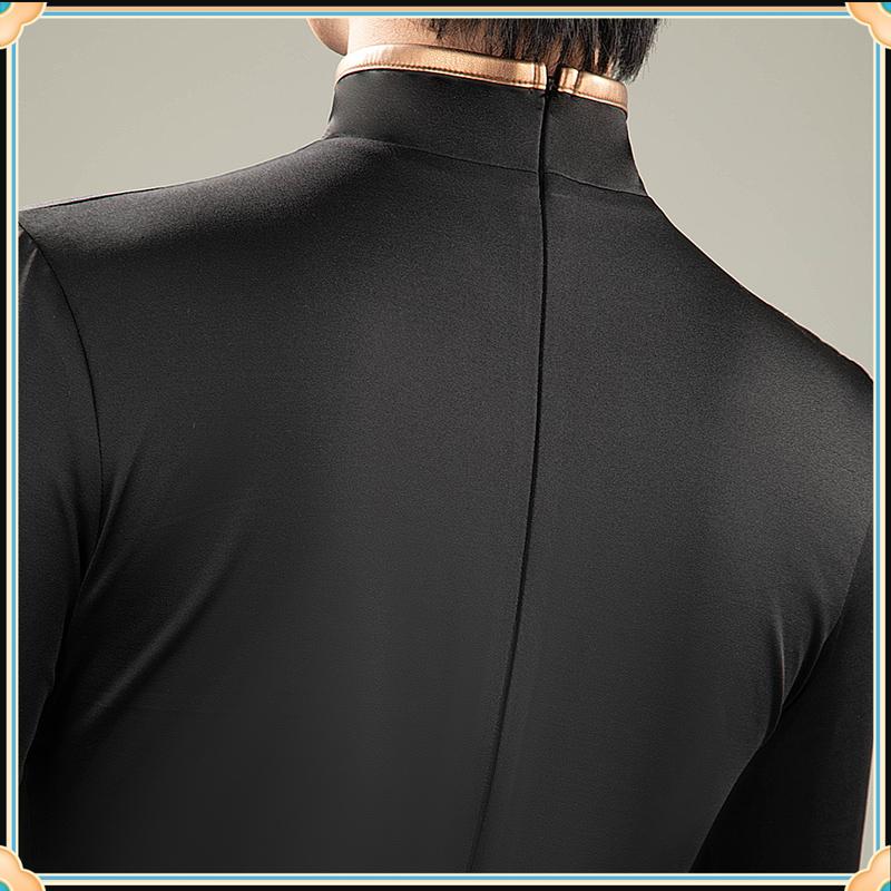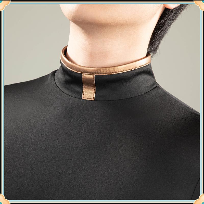 ニット生地で製作しています。ストレッチがあって、着心地と換気性が良いです。襟に金色のラインが縫い付けられて、後ろにたファスナーが付いて、細部な処理などのが完璧です。