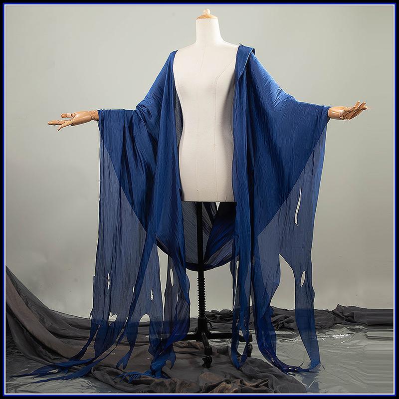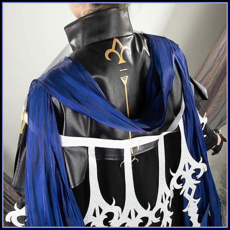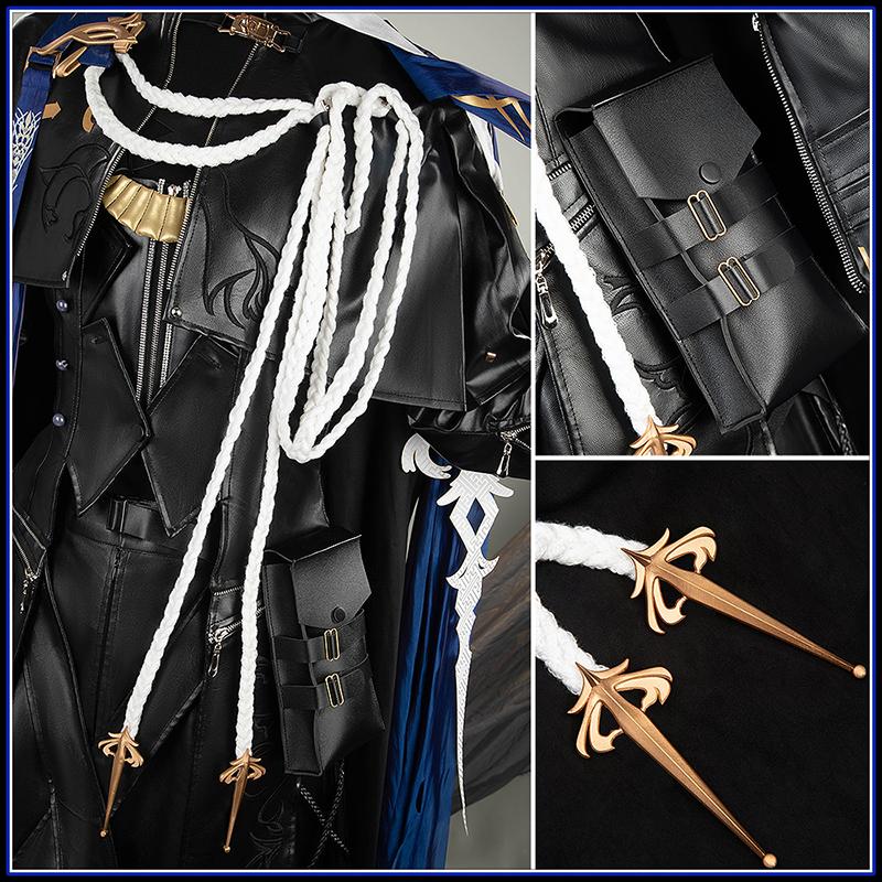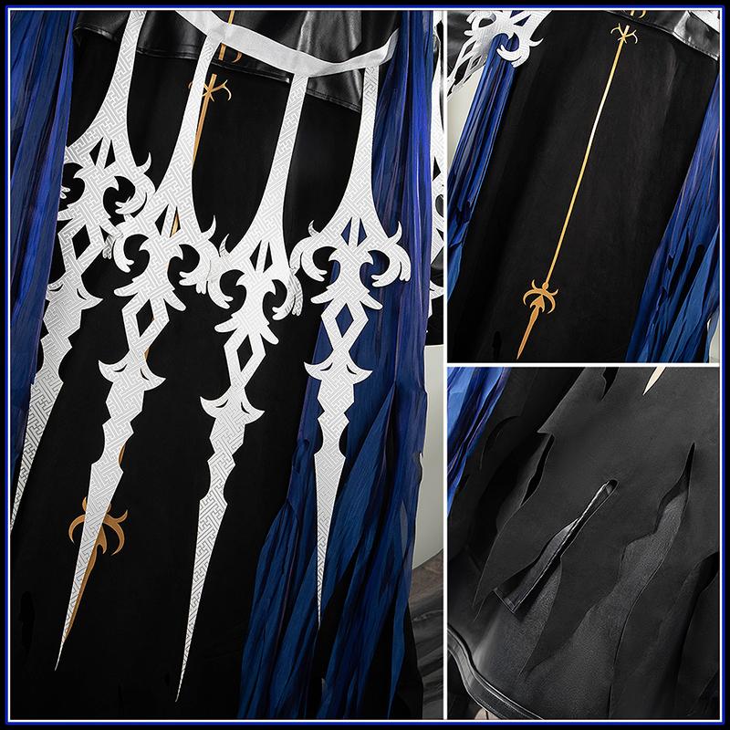 コートはスエード生地と合皮で製作しています。肩掛けは上品なサテン生地で製作しています。後ろの肩掛けと飾り布はレーザー切断技術で製作して、原作に忠実した模様が再現するよう心掛けています。多層構造で、上品な飾りパーツを飾って、華やかさをプラスしてくれます。