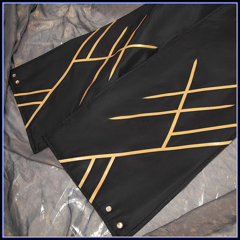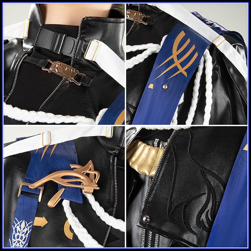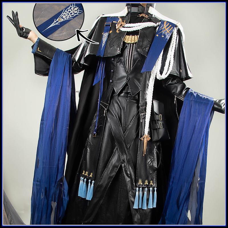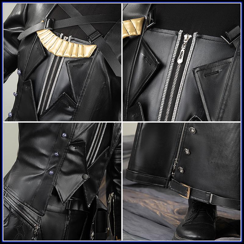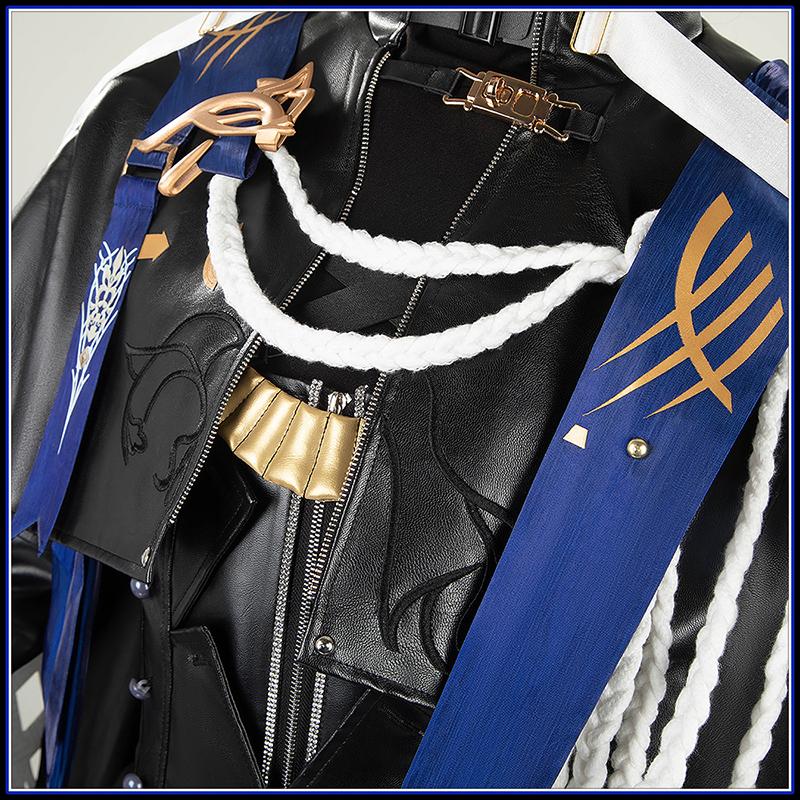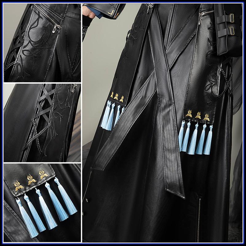 上着は合皮で製作しています。フロントと両側に特徴的な刺繡模様が施されており、長い裾に原作に忠実な柄を箔プリントした。精密な工芸、細部な処理などのが完璧です。
