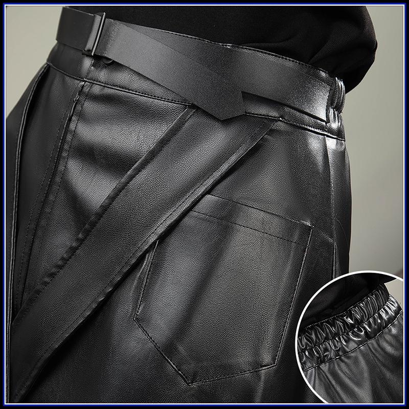 スカートは合皮で製作しています。ウォッシュドレザーを使用し、着心地が良いです。黒を基調として、前にクロスストラップを缝い付けて、ファスナーとポケットも付き、個性的なファッションを演出します。