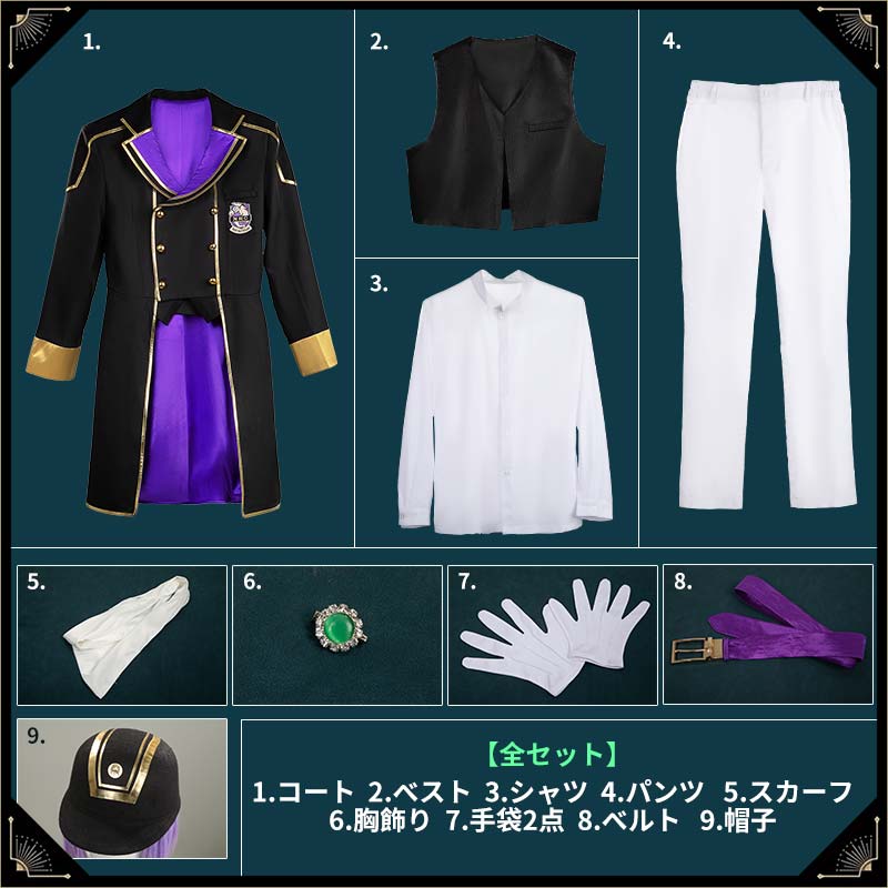 コート、シャツ、ベスト、パンツ、飾り物(胸飾り、手袋2点、ベルト、スカーフ、帽子)