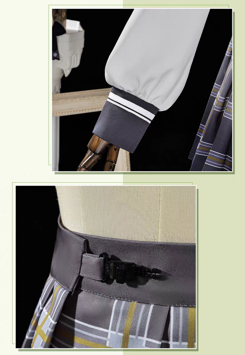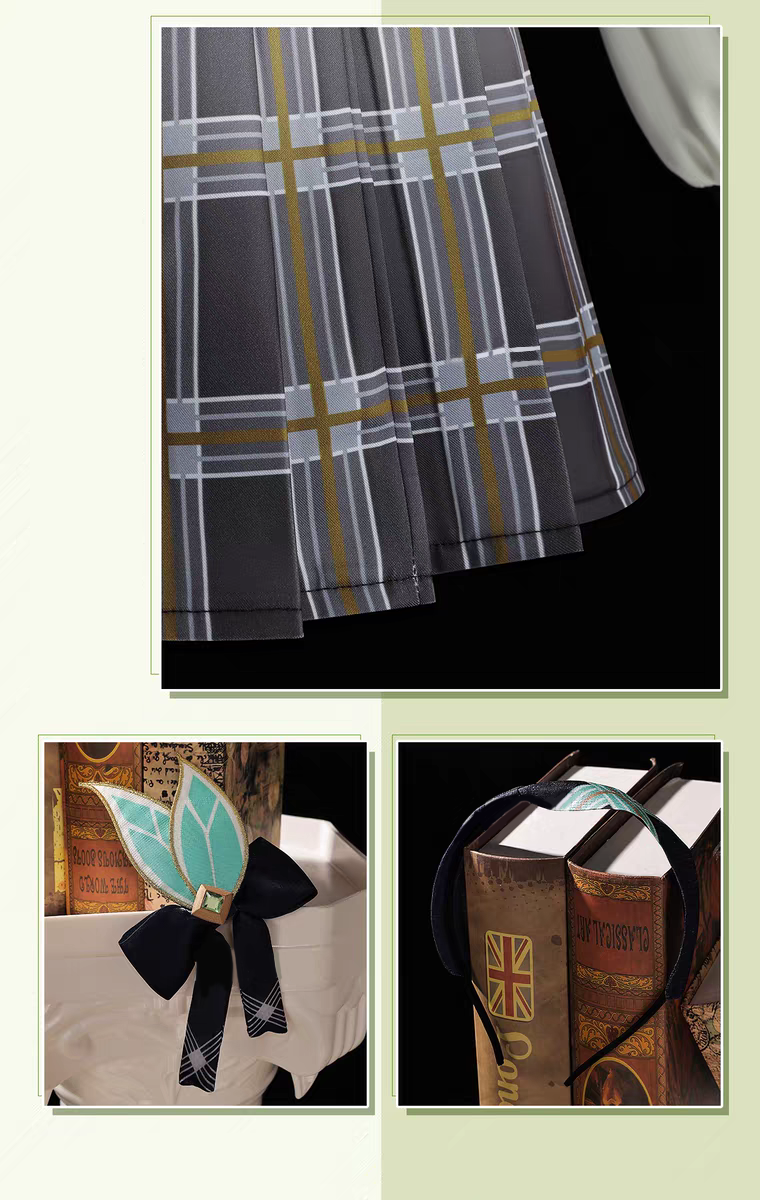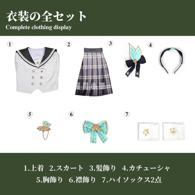 上着、スカート、飾り物(髪飾り、カチューシャ、胸飾り、襟飾り、ハイソックス2点)