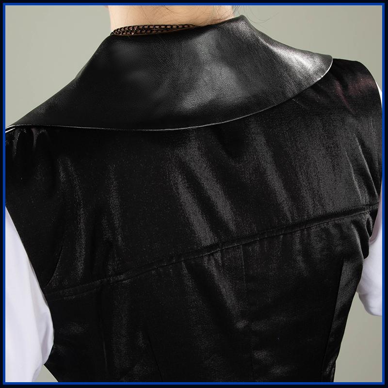 ワォッシュドレザーで製作しています。高級感あふれるブラックのウォッシュドレザーに、ゴールドアクセントのネックラインを施した、レザージャケット風デザインです。