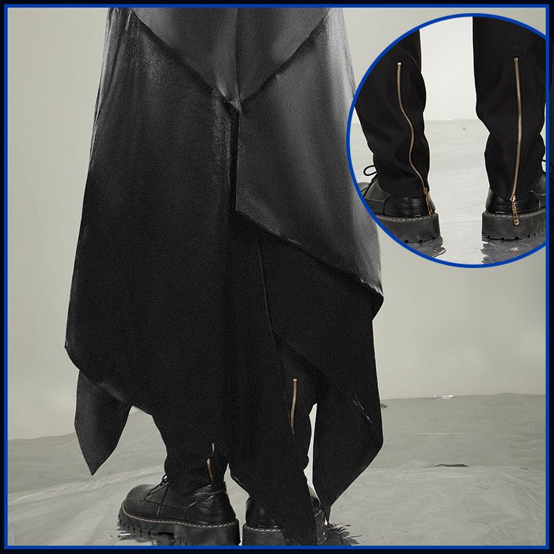 TRサージ(ポリエステルとレーヨン混紡生地)で製作しています。パンツの脚部後面にジッパー仕様を採用、着脱性とシルエット調整を両立した機能性デザインです。