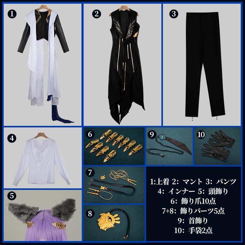 上着、マント、パンツ、インナー、飾り物(頭飾り、飾り爪10点、飾りパーツ5点、首飾り、手袋2点)