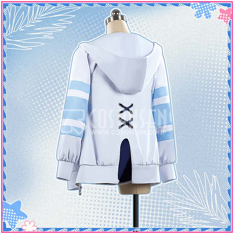 ダンボールニット生地で製作しています。全体はマリン調の白いジップアップパーカーで、袖口と袖中ほどに水色の太めのラインが2本ずつ入っており、スポーティーかつ爽やかな印象。