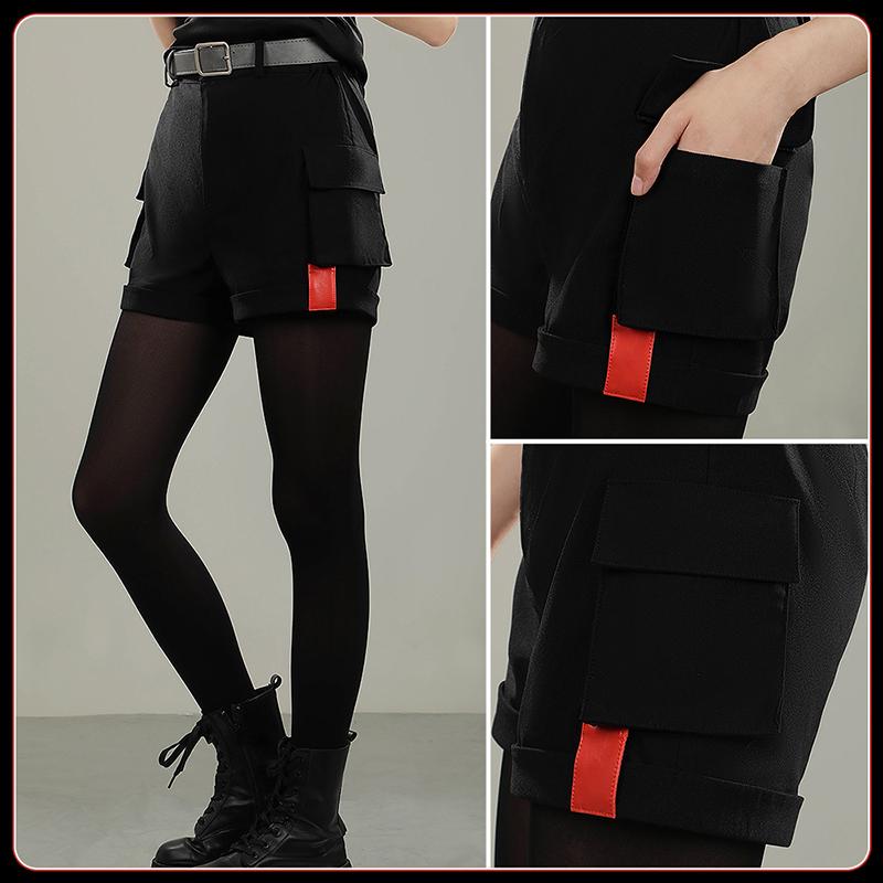 デニム生地で製作しています。カーゴの機能美、ストレッチの快適さをすべて兼ね備えました。立体カーゴポケットが付いています、そして真っ黒なベースにアクティブな赤色が差し込みます、クールな雰囲気に躍動感をプラスします。