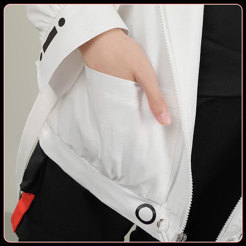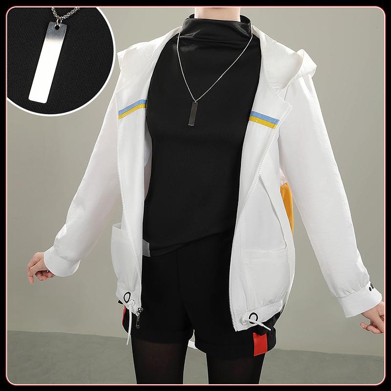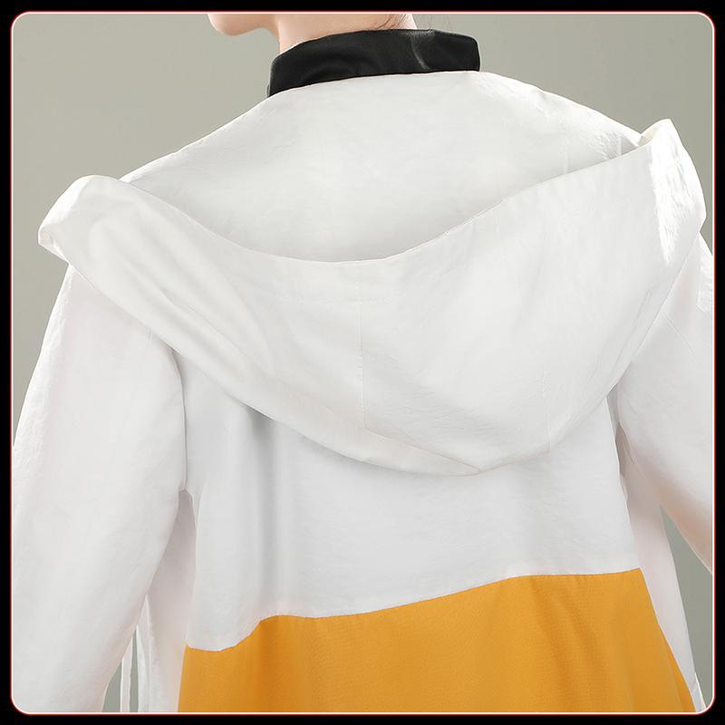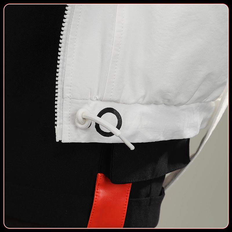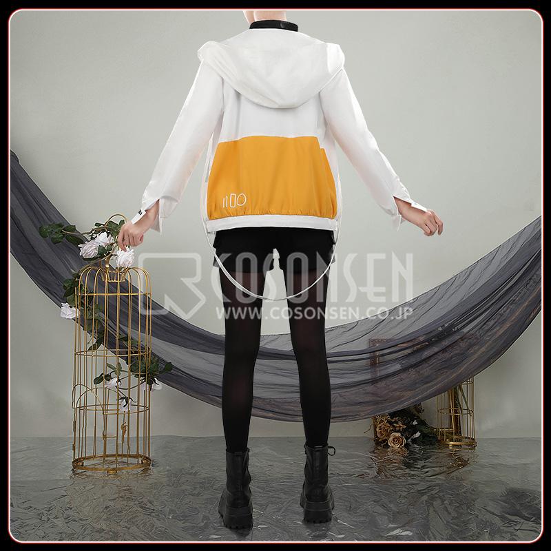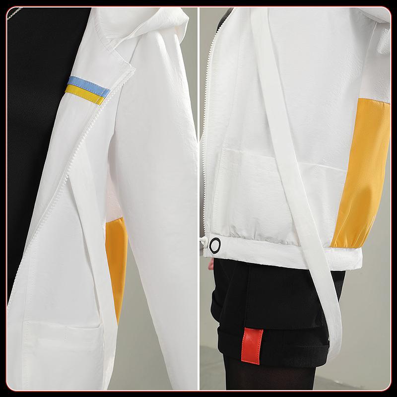 ナイロンコットン混紡生地で製作しています。クリーンなホワイトをベースに、袖と前身頃にカラフルなストライプが入り、シンプルだけどアクセントたっぷりです。そしてフード付きのデザインが可愛らしさをプラスし、普段着としてもコスプレコーデにも使える万能アイテムです。