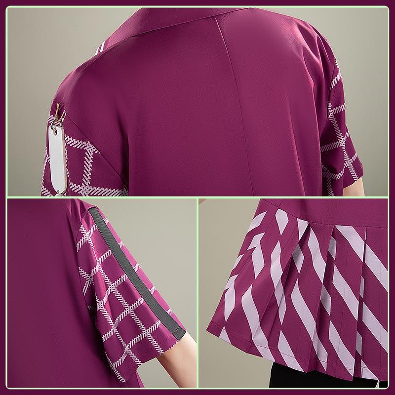 シャツ生地で製作しています。胸元に薄いグリーンのラインが入ったデザインが特徴で、袖口と裾部分には白い格子柄と斜めストライプの白線が施され、下部にはプリーツ状のフリルが追加され、動きが出るように工夫されています。