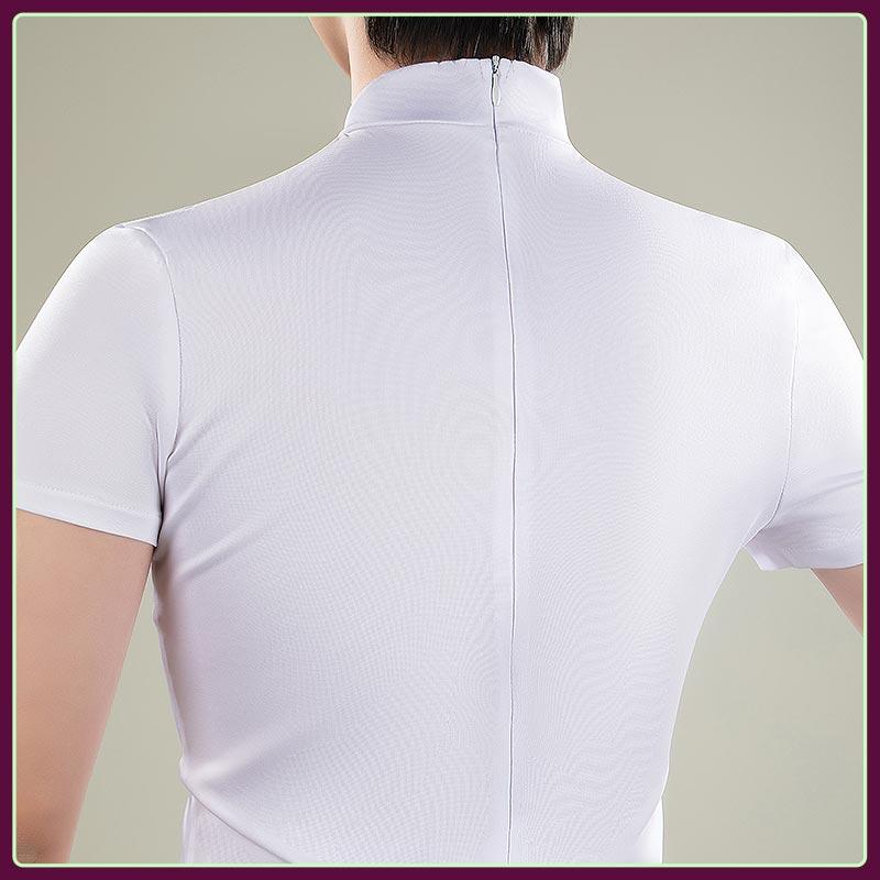 ニット生地で製作しています。白いハイネックTシャツで、伸縮性のある素材を使用しています。首元に緑色の布地を巻き付けることでアクセントを加え、背面にはファスナーが付いており、着脱がしやすくなっています。
