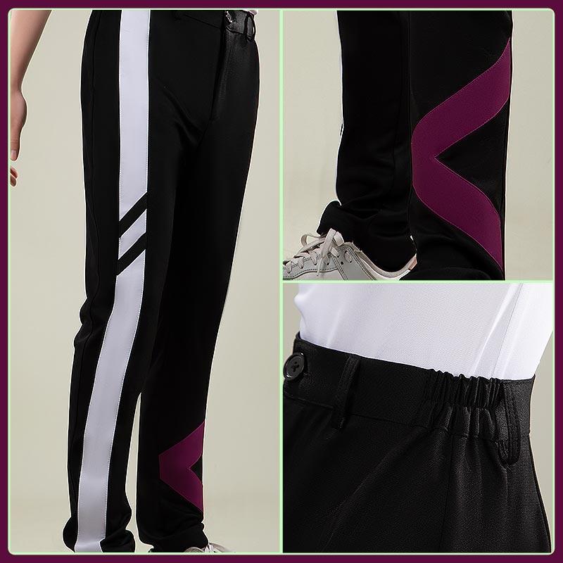 ニット生地で製作しています。スリムフィットのパンツで、左腿部分に白いサイドラインと紫色の矢印風アクセントが入っています。