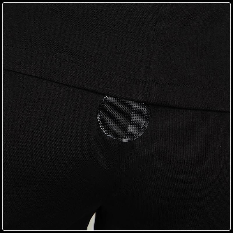 ニットで製作しています。ハイネックにレザー調のカラーアクセを配し、金属製のパーツのような柄がクールな雰囲気を際立たせます。身体ラインを強調するスリムカットで、長時間着用しても疲れにくい、しなやかなフィット感を実現します。