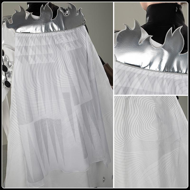 高密度サテンで製作しています。炎をイメージした立体的な装飾が、まるで王権や神話の存在であるかのような威厳を放ち、一挙手一投足で存在感を強調します、裾の不規則なカットアウトは羽根や炎の流れを連想させます。