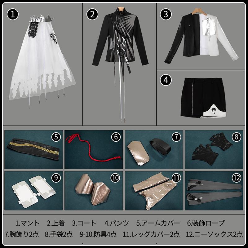 マント、上着、コート、パンツ、飾り物(アームカバー、装飾ロープ、腕飾り2点、手袋2点、防具4点、レッグカバー2点、ニーソックス2点)