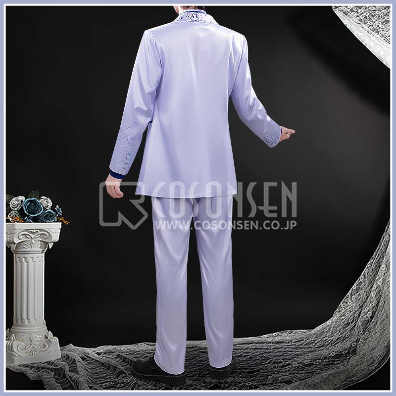 マットサテンで製作しています。ラペルには青い花枝模様の繊細な刺繍が施され、袖口や裾周りにも同模様のプリントや刺繍が控えめに入っています。全体的にエレガントで華やかな印象のデザインです。