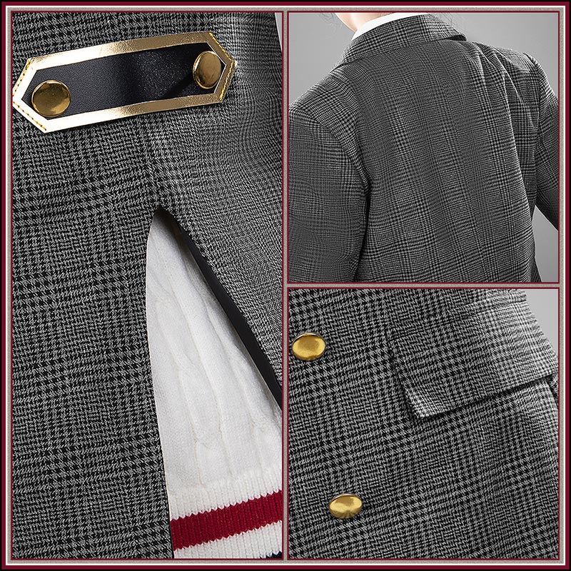 リネンコットンで製作しています。グレー基調のクラシックなチェック柄で、ダブル6つボタンが特徴的。袖口にも金ボタンが3つ並び、背面にはベルト付きのバックベントが設けられている。