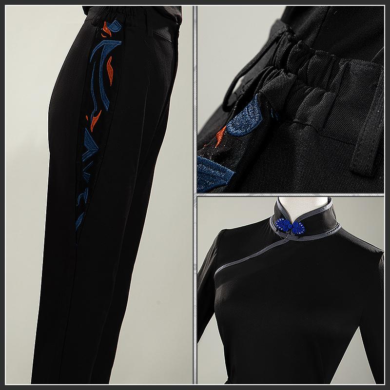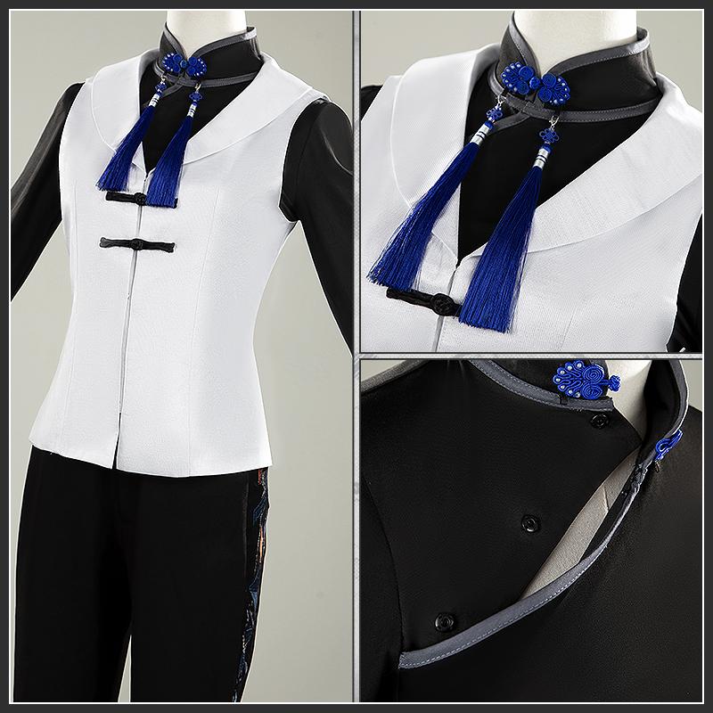 ニットで製作しています。ストレッチありの素材を使用し、着心地も良好な作りになっています。襟元には青い中華結び風の装飾が施されており、ポイントとして際立っています。また、襟周りや身の一部にはグレーの縁取りがあり、デザインに深みと精緻さを加えています。