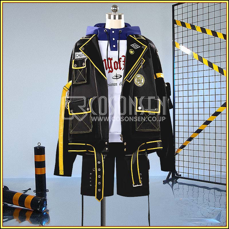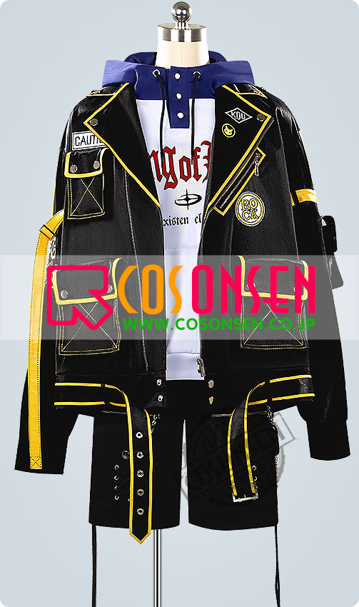 光沢布で製作しています。黒を基調とした、黄色の縁取りとステッチがアクセント。複数のポケットとベルトが配置され、袖に白と黄色のストライプが入り、機能的でロックテイストの強いスタイル。