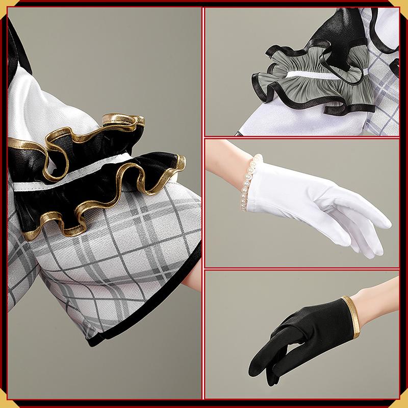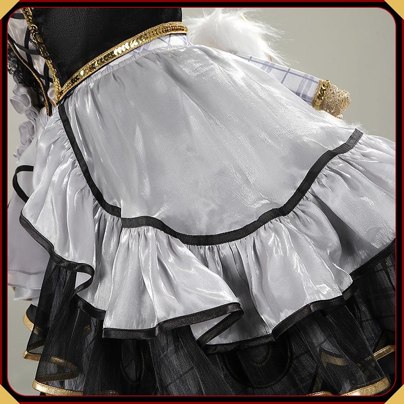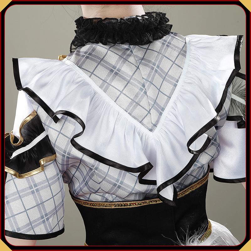 ポリエステルで製作しています。多層フリル構造で、前短後長のアシンメトリーカットが大人気。チェック柄と黒のシアー素材の組み合わせに、金色レースとビーズ装飾が施され、動くたびにキラキラと輝き、圧倒的な存在感を放ちます。