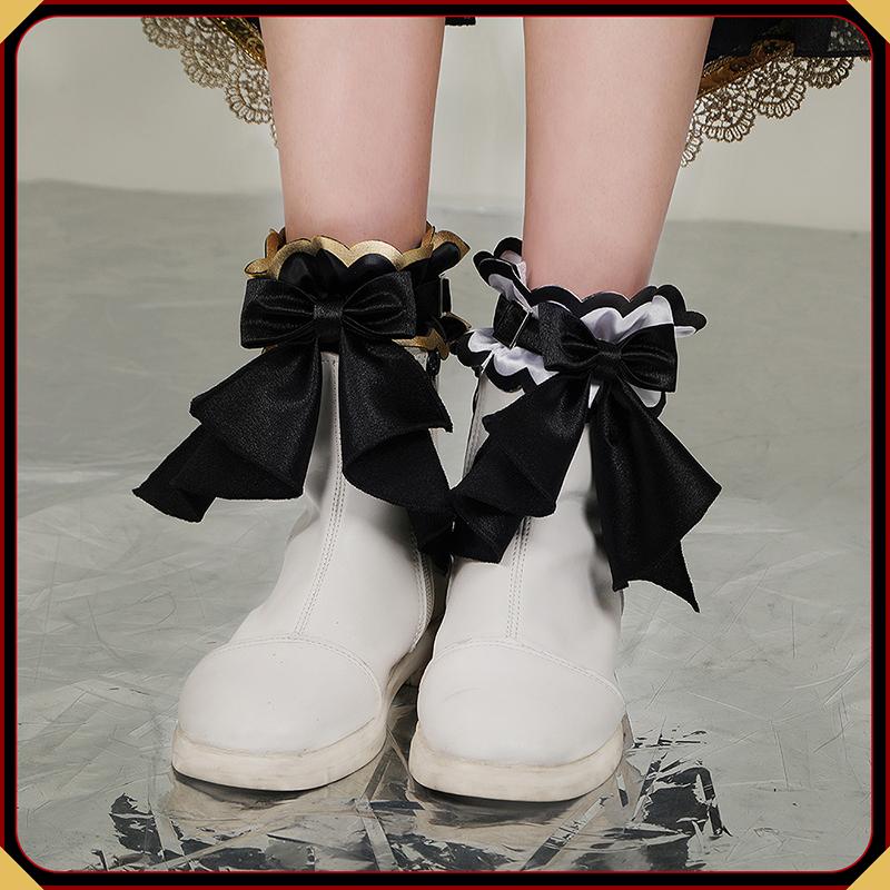 ポリエステルで製作しています。フリルとレースが組み合わさった立襟に、華やかなボウタイとゴールドの装飾がアクセントを添えます。袖付け部分には立体的なリボンとフリルが配され、ショートスリープは活動的な着用感を提供しつつ、ゴールドのラインが全体の精緻を引き立てます。