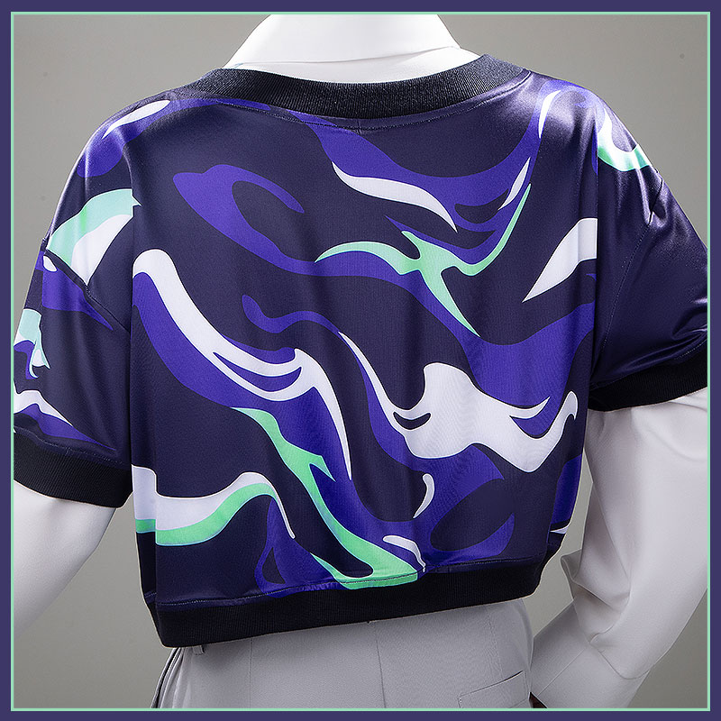 ポリコットンで製作しています。白を基調とした長袖のクロップトップで、胸元には抽象的な動物ロゴがポップで可愛らしい印象を与えます。袖部分には青い二本のストライプラインが縦に走り、動きやすさを考慮したゆったりとしたシルエットです。