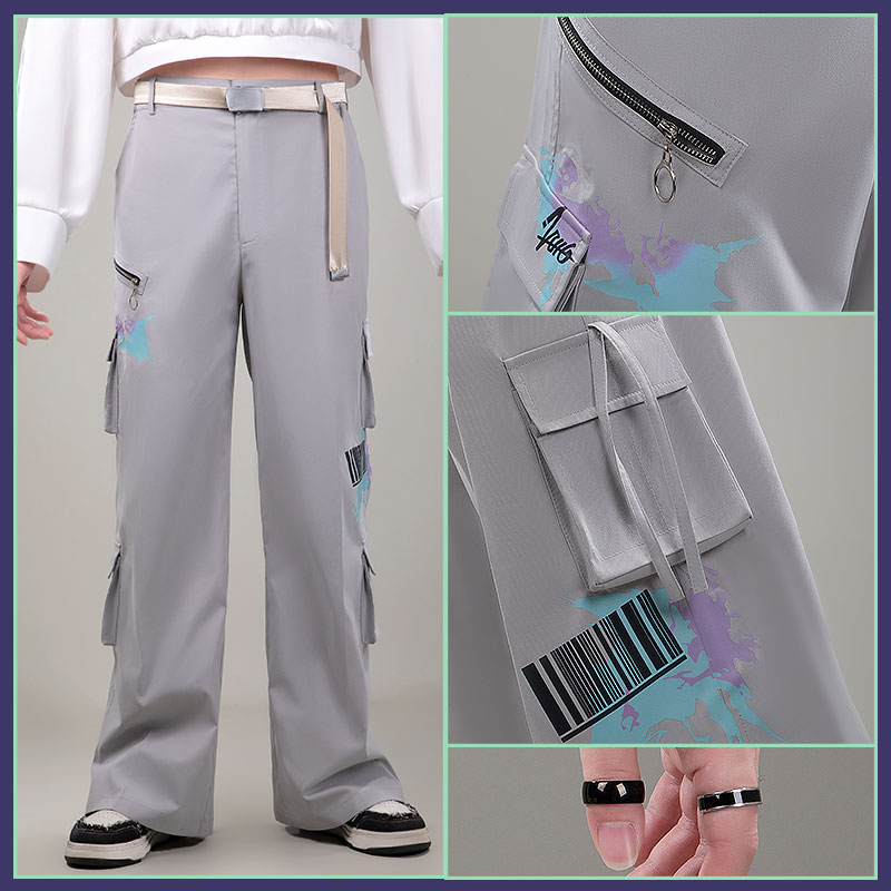 クールシルクコットンで製作しています。グレーを基調としたワイドレッグのカーゴパンツで、複数のジッパー付きポケット(サイドとバック)が配置され、腿部分にはスプラッシュプリントやバーコードが施され、グラフィカルで現代的なアクセントとなっています。