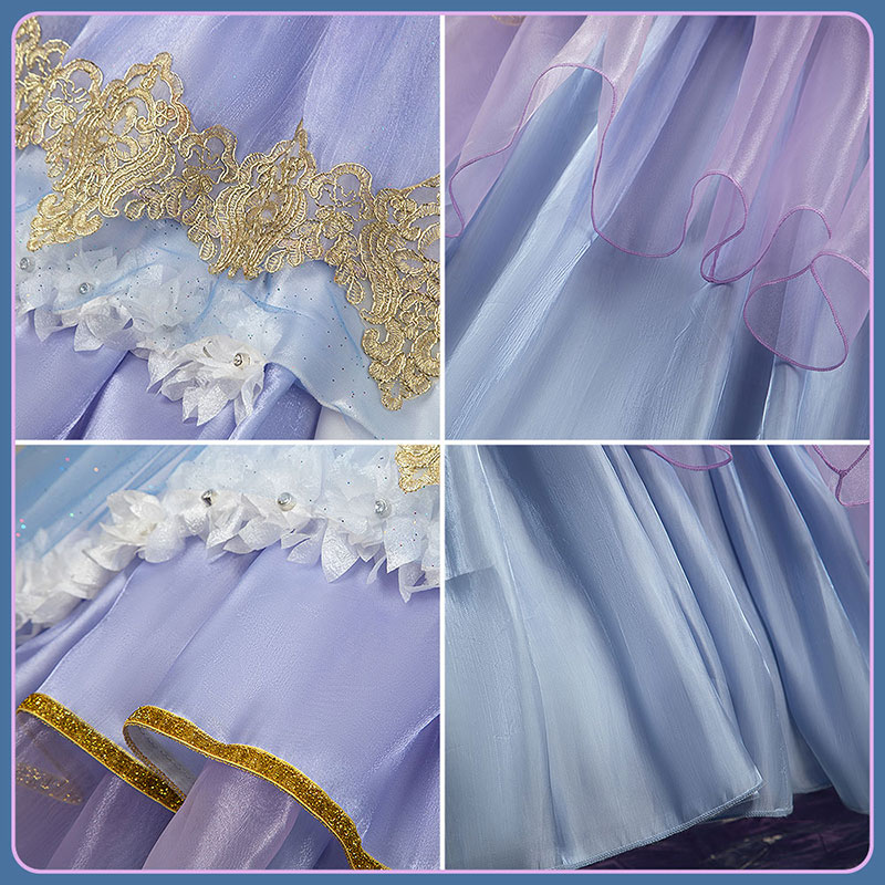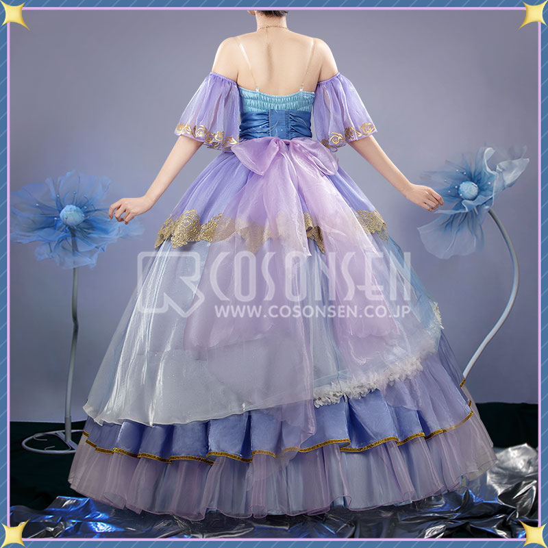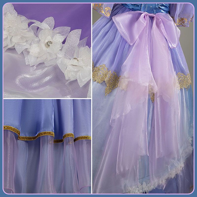 オーガンザで製作しています。バスト中央には金色の立体的な刺繍がアクセントとなり、ウエストには青いベルトに白い真珠風のボタンが飾られ、上品な雰囲気を醸し出しています。背面のウエストに大きなパープリリボンが配され、華やかなアクセントになっています。また、スカート上部には金色のレースが装飾され、正面とに統一感を保っています。