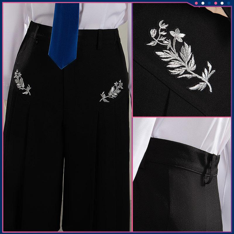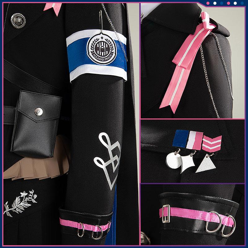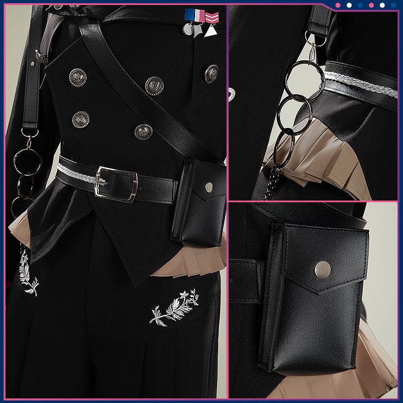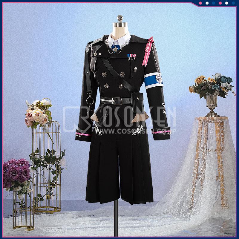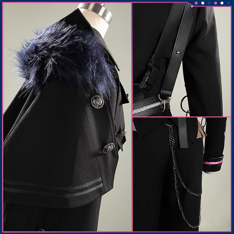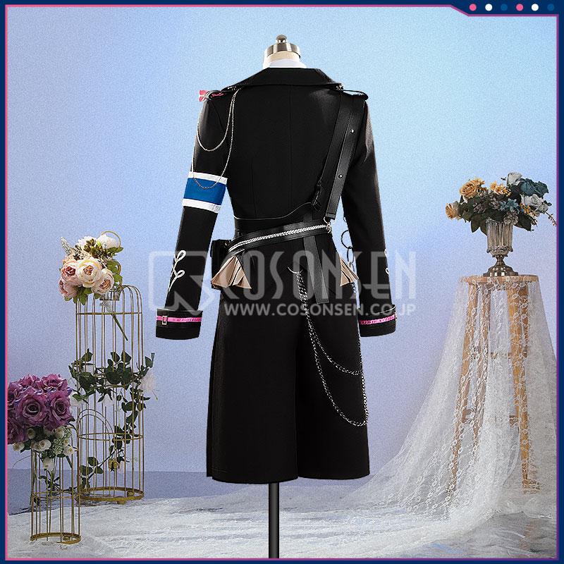 TRサージで製作しています。監獄風をベースにしたブラックのダブルブレスト上着で、精緻なディテールが見どころの一つです。シルバーのボタン、ピンクのリボン、メダル、袖章がアクセントとなり、制服風と格好さを融合させています。