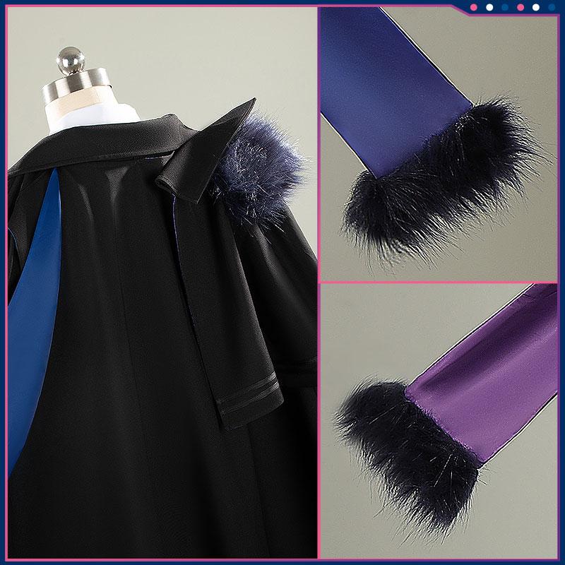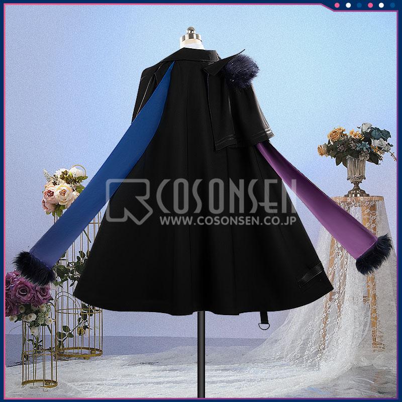 ポリエステルギャバで製作しています。黒の本体に、肩にファー風装飾がアクセントを添え、さらに青から紫へと色移りする長尺リボン風装飾が側面に配され、その末端にもファーが施されており、動くたびに優雅な揺れでファンタジーな雰囲気を醸し出しています。