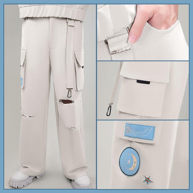 デニム生地で製作しています。膝周りにダメージ加工が施され、冒険的なディストレストルックを加えています。複数のカーゴポケットがサイドに配置され、パッチとしてラベルやモチーフがアクセントになっています。