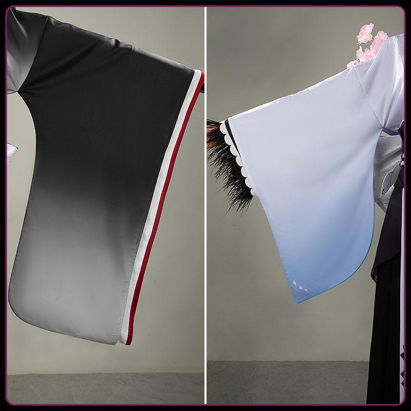 光沢サテンで製作しています。左右非対称のグラデーション設計が特徴で、縁は赤のパイピング、襟元は黒の波型スカラップ縁取りで高級感を演出。左胸と右肩に鶴の家紋刺繍入り。袖口には黒のフェザートリムがあしらわれ、極の鶴丸らしい優雅さと妖しさを両立した逸品です。