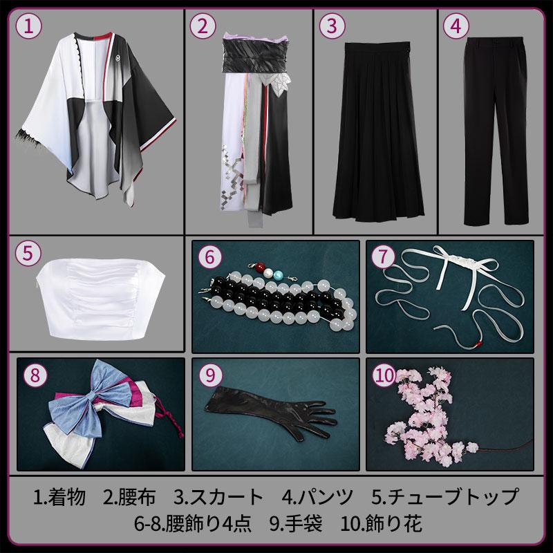 着物、スカート、パンツ、チューブトップ、飾り物(腰布、腰飾り4点、手袋、飾り花)