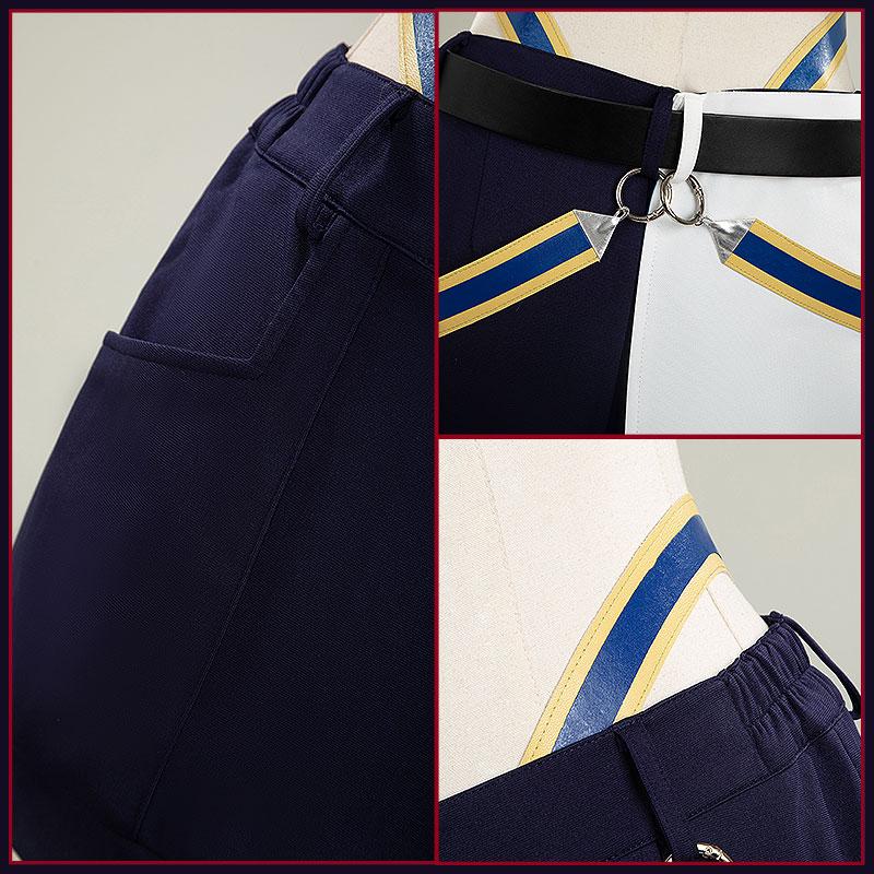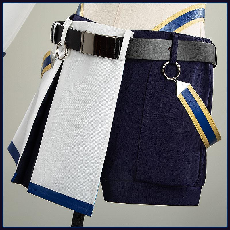 TRサージで製作しています。白と水色を組み合わせたレイヤードスカートで、裾部分には紺色のラインが装飾されています。明るいカラーリングで華やかさを出しつつ、動きやすいシルエットに仕上っています。