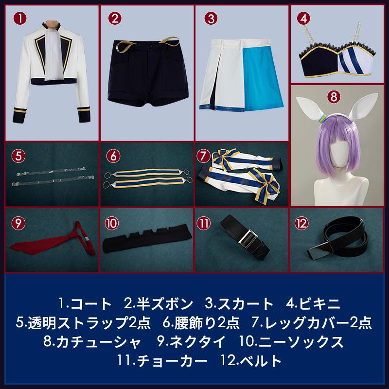 コート、半ズボン、スカート、ビキニ、飾り物(透明ストラップ2点、腰飾り2点、レッグカバー2点、カチューシャ、ネクタイ、ニーソックス、チョーカー、ベルト)