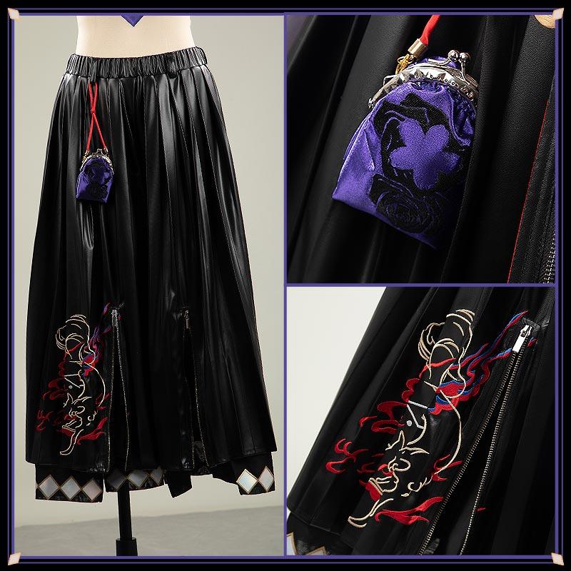 フェイクレザーで製作しています。鮮やかな刺繍デザインが施され、裾部分には金枠付きの菱形装飾がアクセントを添えています。ベルト周りにはポケットや巾着袋などが付属し、個性的かつ実用的なデザインです。