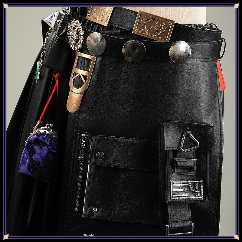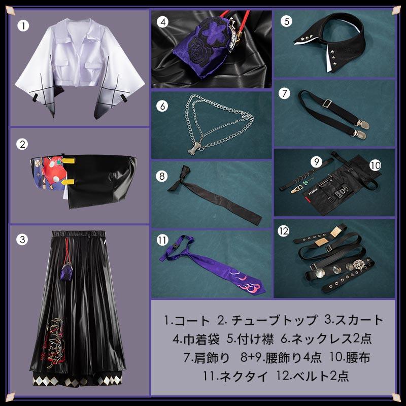 コート、チューブトップ、スカート、飾り物(巾着袋、付け襟、ネックレス2点、肩飾り、腰飾り4点、腰布、ネクタイ、ベルト2点)