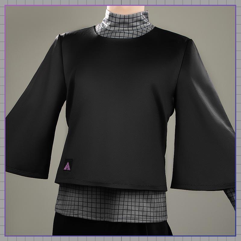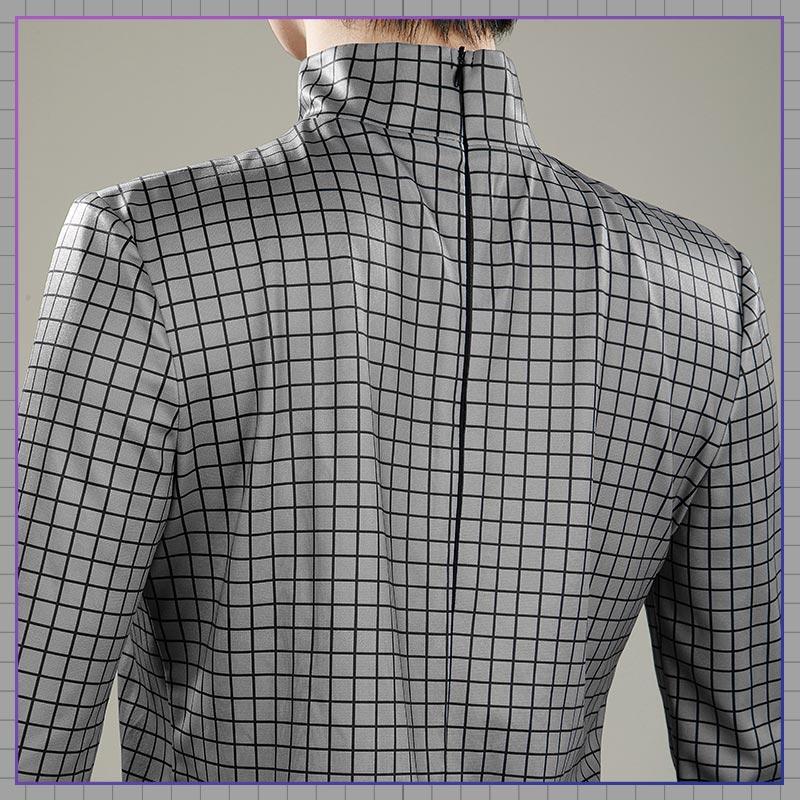 ニット生地で製作しています。黒とグレーのチェック柄のハイネック長袖インナーで、体に密着するフィットタイプのカットになっています。