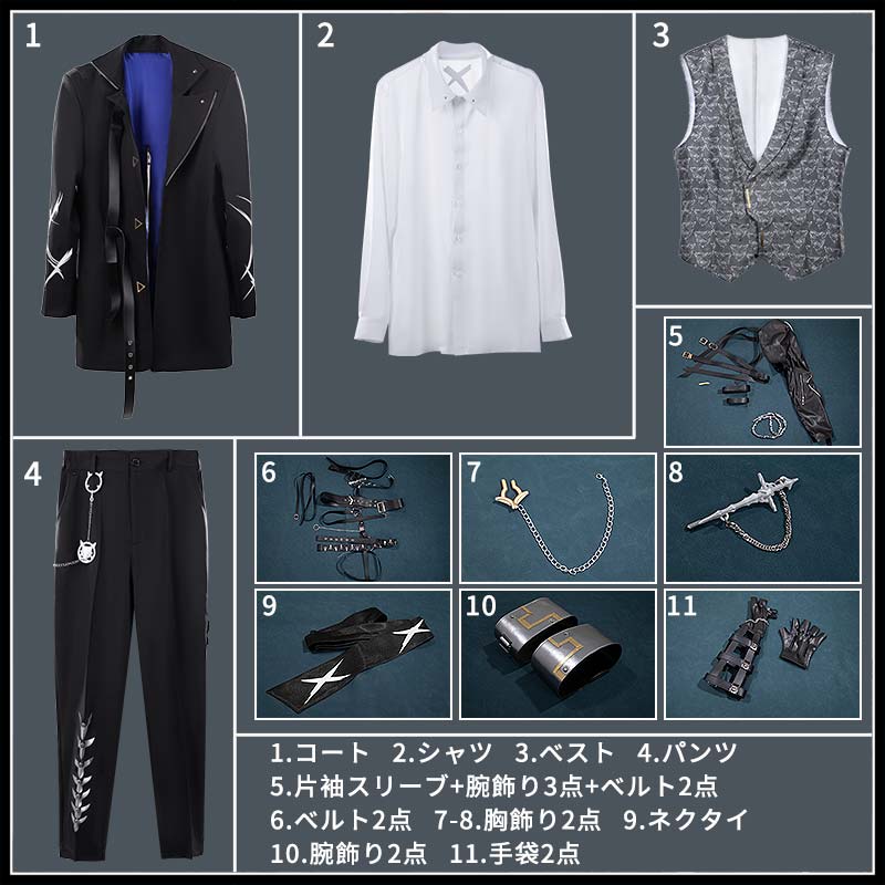 コート、シャツ、ベスト、パンツ、飾り物(片袖スリーブ、腕飾り3点、ベルト4点、胸飾り2点、ネクタイ、腕飾り2点、手袋2点)