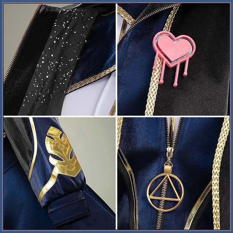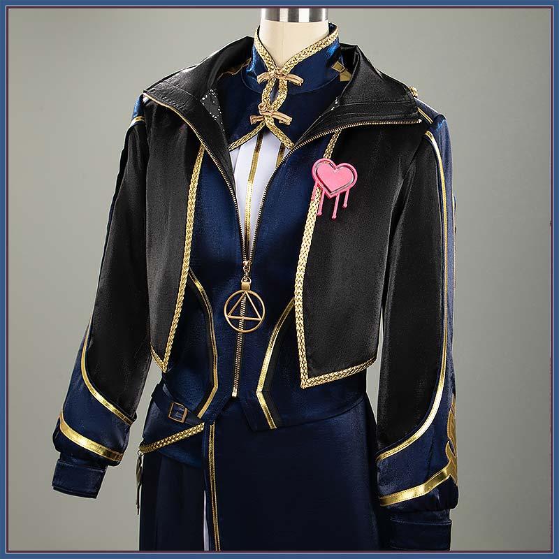 光沢布で製作しています。胸元には中華風の紐が付き、肩には金色の星型アップリケが付いています。背面は尖った燕尾のようなカットで、動きが出る劇的なシルエット。