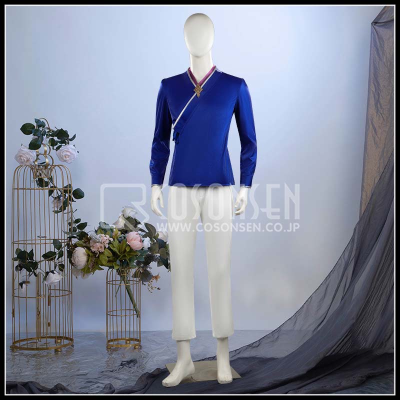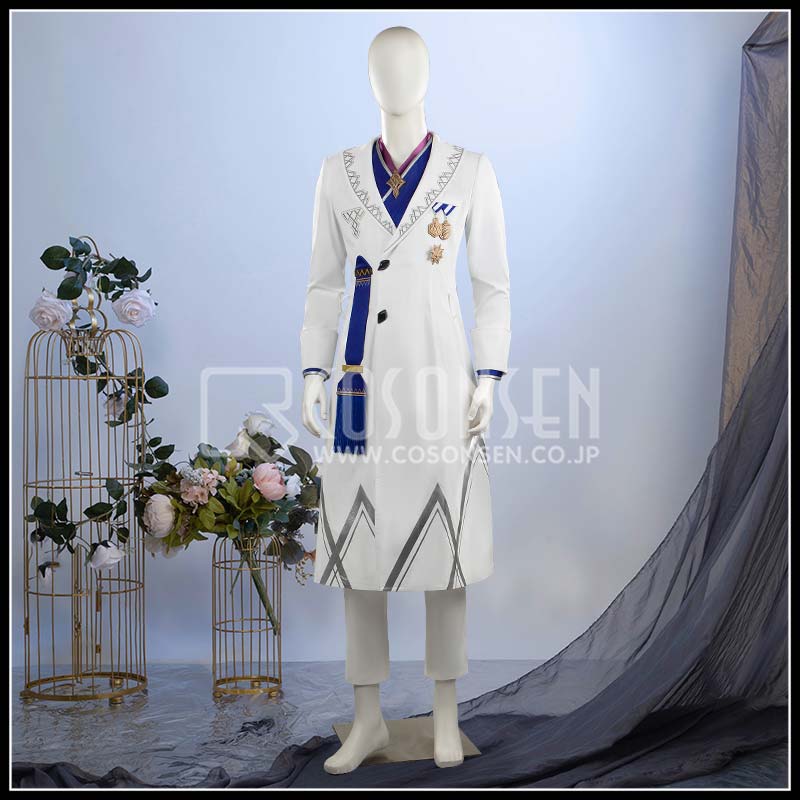 クールシルクコットで製作しています。胸元から裾にかけての幾何学的なシルバー刺繍と山形ライン、左胸の星型バッジや青×紫のタッセル、腰ベルトの金具まで全てが細かく再現されてて尊い。