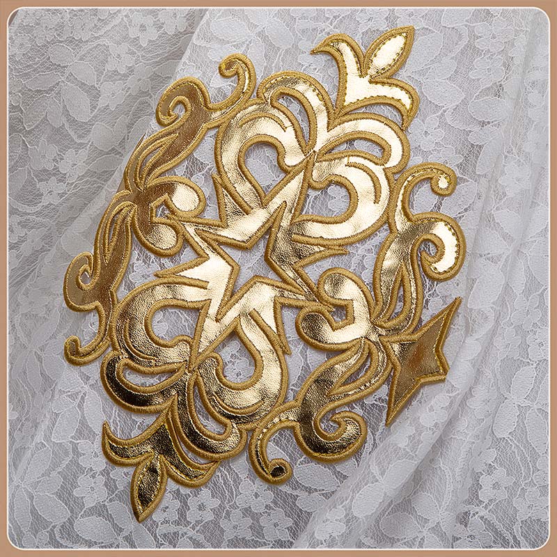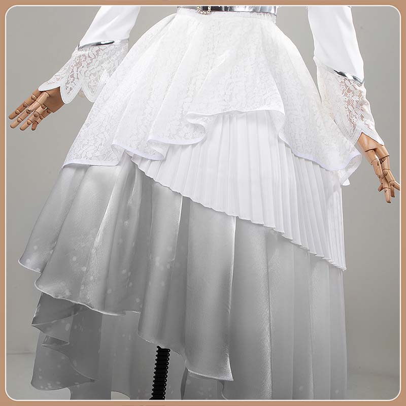 レース生地で製作しています。ノースリーブの白を基調としたロングワンピースで、上身頃は繊細な花柄レースのオーバーレイが施され、透明感と優雅さを演出しています。スカート部分は多層レイヤード構造で、下層サテンには雪のような細かいドットプリントが入り、冬の幻想的な雰囲気を表現。